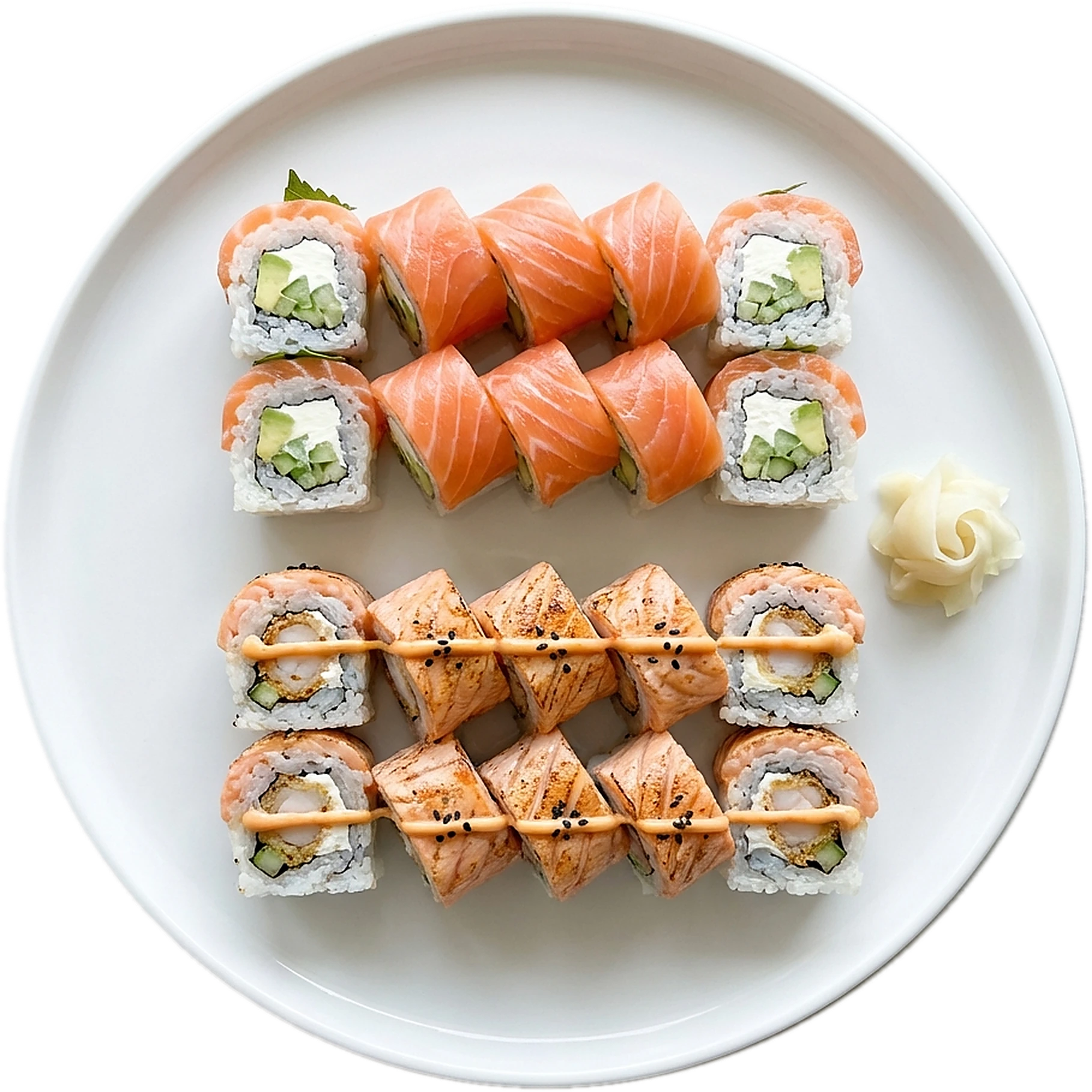 Jazz + Sunset. 20 шт на двоих: свежий лосось и ролл с темпурной креветкой под опалённым лососем. Соевый соус, имбирь и васаби в комплекте.